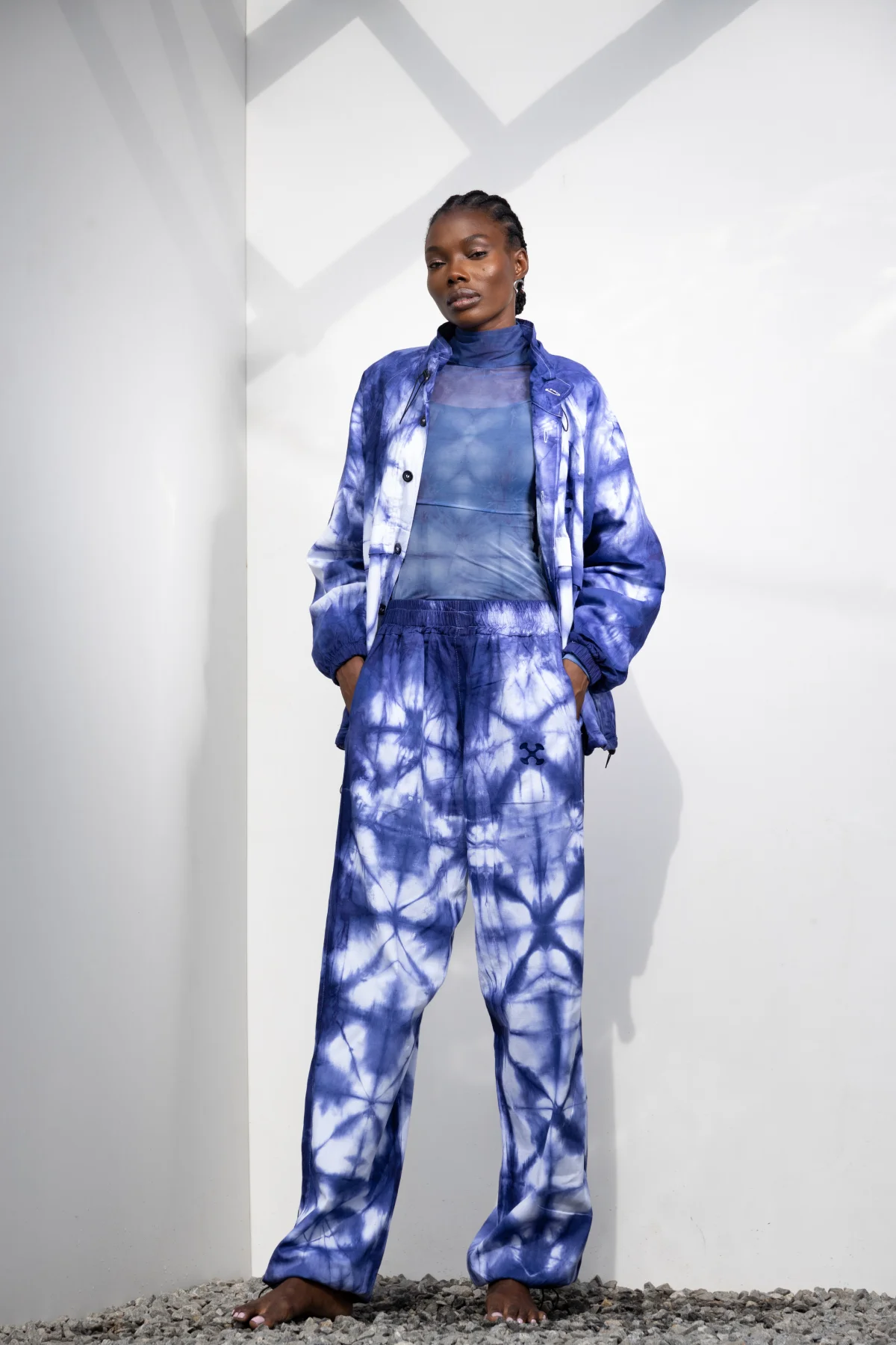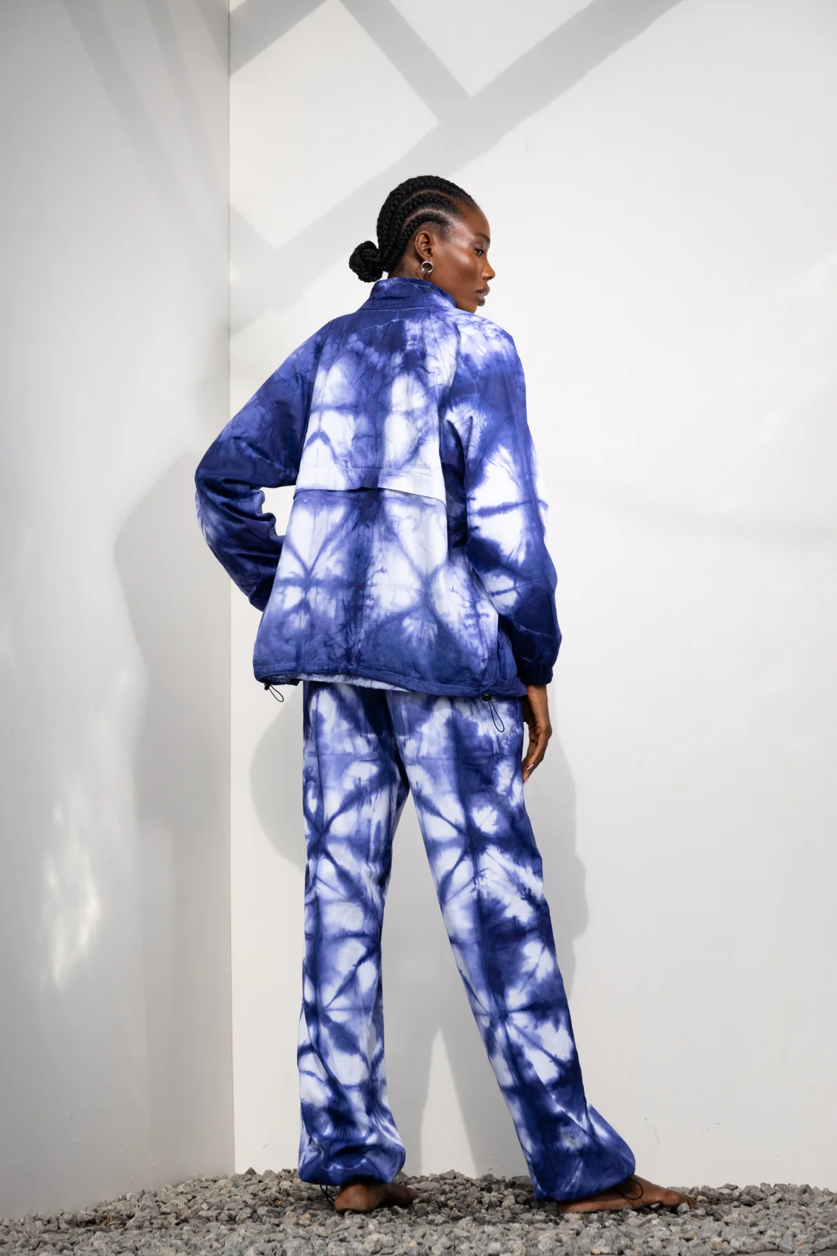 The BLBrand Xtrack pant has a unique shibori tie and dye pattern, made from a light cotton fabric. Featured with an elastic waistband for a perfect fit. A monogram of the Blbrand logo is displayed on the pocket area, and it has an elasticated rope with a stopper at the bottom of the pants. You can pair it with the Xtrack jacket for men.